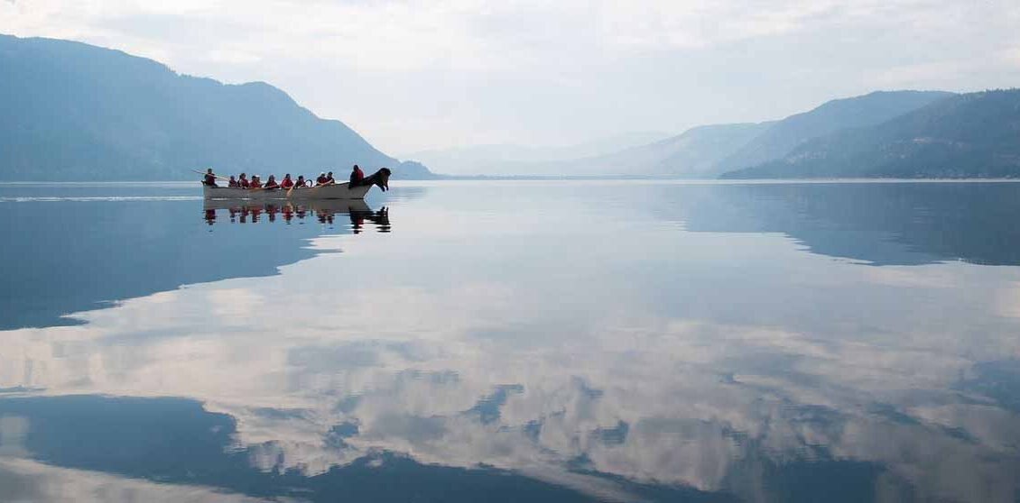 The canoe journeys begin with a feeding of the water ceremony. As the canoe glides across the lake’s glassy surface, a syilx cultural leader scatters sage and tobacco in the water while summoning the spirit world and telling his ancestors to keep everyone safe. Moccasin Trails co-owner Greg Hopf says the ceremony is powerful, and meant to illustrate the connection Indigenous people have with the earth, which is highly personal.