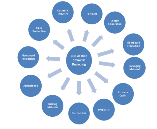 Rice straw residue can be used as a renewable source of energy, produce eco-friendly useful products. A new environmentally friendly technology is being developed to convert rice straw into quality value-added composite products. Straw particleboard has a broad applications because of its rigidness, strength and low cost. Rice straw can be used as non-wood raw material. The future of rice straw recycling looks capable with advancements in technology, partnerships for sustainability, supportive policies, and expanding markets. Innovations like biorefining and genetic engineering offer opportunities to extract valuable compounds from rice straw efficiently. Relationship between agricultural sectors, waste management industries, and renewable energy producers can optimize resource use. Governments are implementing policies like subsidies and tax incentives to encourage eco-friendly practices. As consumer demand for sustainable products grows, industries are exploring new marketing strategies. By working together globally, sharing knowledge, and engaging local communities, we can increase the environmental and economic benefits of rice straw recycling for a more sustainable future.