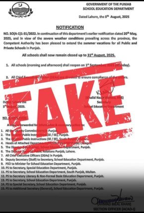 A fake notification suggesting that all Punjab schools will remain closed until August 31 has been debunked by the Punjab School Education Department, which confirmed that no such decision has been taken.